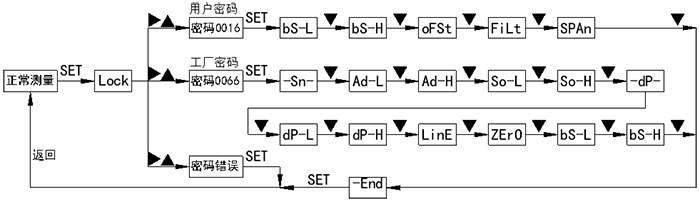 4.1按鍵功能說明 4.1.1設(shè)定鍵“SET” ?測量模式下短按為開,進(jìn)入密碼設(shè)置。 ?設(shè)置模式菜單顯示時,短按為使能參數(shù)修改,顯示當(dāng)前菜單對應(yīng)參數(shù)值,再次短按確認(rèn)參數(shù)修改,返回菜單顯示狀態(tài)。 4.1.2移位鍵“?” ?測量模式下短按無功能。 ?測量模式下長按5秒執(zhí)行主變量清零功能。 ?設(shè)置模式下為移位與減一功能。 4.1.3增加鍵“▲” ?測量模式下短按與長按無功能。 ?設(shè)置模式下為加一功能。 ?ADC采集菜單下短按為采集使能。 4.1.4按鍵功能綜述 儀表通過面板的三個按鍵實現(xiàn)所有的參數(shù)輸入和校準(zhǔn)數(shù)據(jù)的設(shè)置、采集,本儀表的設(shè)置和輸入采取了多種優(yōu)化措施來提高客戶的操作速度: ?儀表的移位鍵和增加鍵具有變速率功能。 ?儀表同時具有移位和增量輸入方法,針對需要大量數(shù)修改的菜單使用移位方式,需要連續(xù)輸入數(shù)據(jù)的菜單采取了增量方式。 ?儀表在設(shè)置狀態(tài)下會停止模擬輸出,在用戶設(shè)置模式下如果30秒內(nèi)用戶沒有操作儀表,則會自動退出到測量狀態(tài)。 ?儀表在正常退出菜單的時候才會保存所有設(shè)置的參數(shù)。 4.2主變量清零 ?主變量清零即PV清零,是相對大氣壓下的零點,不是傳感器量程的零點。將變送器直接置于大氣壓下,長按“?”鍵5秒以上,即可進(jìn)入主變量清零功能。 ?若變送器已經(jīng)執(zhí)行過清零操作,再此執(zhí)行清零操作時將恢復(fù)未清零狀態(tài),如需重新清零則需要再執(zhí)行一次清零操作。 ?清零范圍為變送量程的25%,超出此范圍時將不執(zhí)行清零功能。 4.3設(shè)置框圖