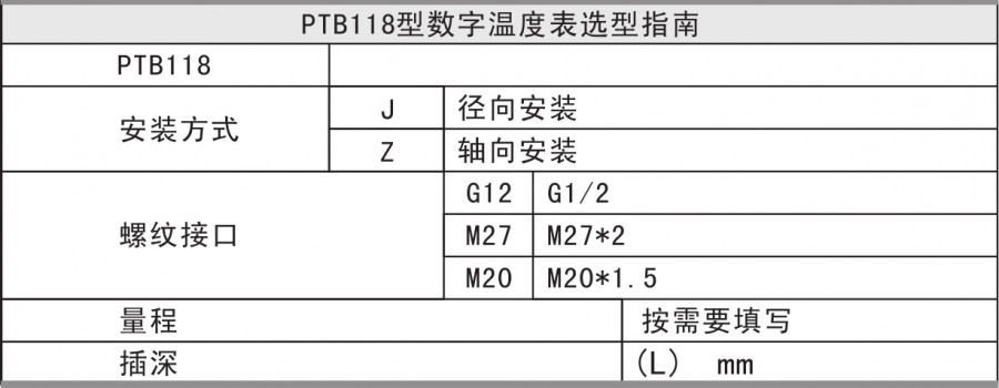 PTB118數(shù)字溫度表為全電子結(jié)構(gòu),采用電池供電,現(xiàn)場安裝簡易。采用高精度PT100,由LCD顯示器顯示出實(shí)際的溫度值。 該數(shù)字溫度表使用靈活,操作簡單,調(diào)試容易 ,安全可靠。廣泛應(yīng)用于水電,自來水,石油、化工,機(jī)械,液壓等行業(yè),對(duì)流體介質(zhì)的溫度進(jìn)行測量顯示。